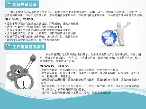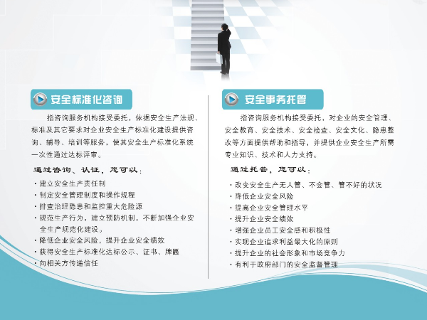 安全生产标准化咨询、安全技术咨询、环境管理咨询、质量管理咨询、企业内训、专业技术咨询、企业管理咨询、社会经济咨询等。